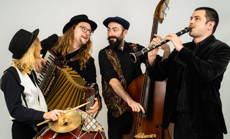 Meaning 'Klezmer Songbird' in Yiddish, the quartet is led by clarinettist John Macnaughton, and features some of the UK's leading Klezmer musicians; Josh Middleton (Don Kipper, Raka Balkan Band) on accordion, Theo Malka-Wishart (Oysland) on double bass, and Christina Borgenstierna (She'Koyokh) on percussion.